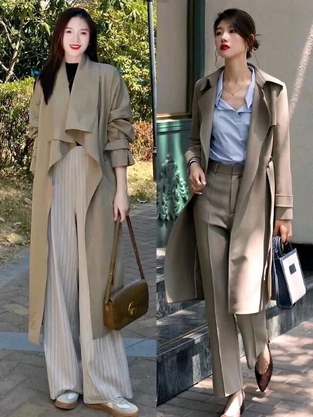 不过在选择裤子的时候,可以根据自己的身材比例而定,如果你腿型修长笔直,你确实可以选择一条修身的牛仔裤来搭配,展现你的大长腿,如果你腿型不是那么的笔直,建议大家选择西装裤或者是阔腿裤来搭配上风衣,这种裤子挺括有型,能更好的遮住腿粗胯宽,这样的问题。