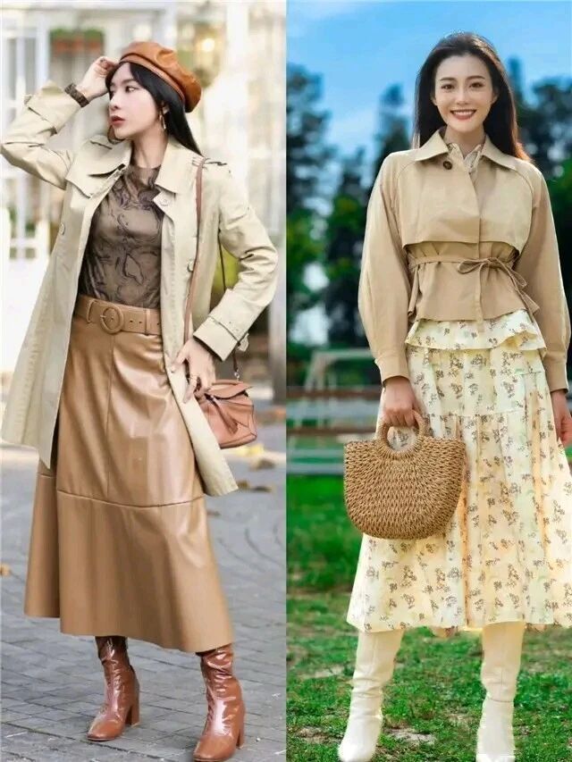 穿衣配色越简约越容易穿出高级感,例如下面这2套穿搭都是选择了卡其色的风衣来搭,一件白色的衬衫或者是针织上衣,下半身选择的也是白色的半身裙,这样的衣服色彩搭配,就算照着穿也不会出错。