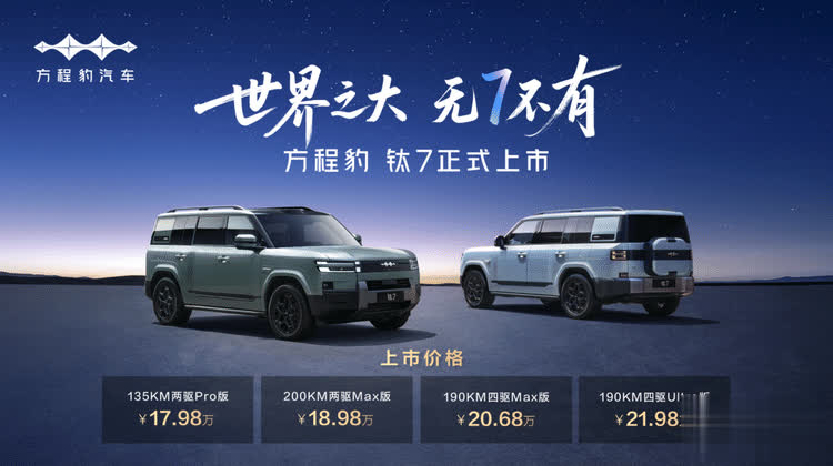 比亚迪旗下的方程豹品牌又推出了一款全新的新能源中大型SUV-钛7。新车指导价为17.98-21.98万,此外,方程豹钛7有着近5米的车长和近2米的车宽,所以外观看起来是比较大气的,同时新车全系采用大五座的座椅布局,车内座椅调整方式以及俯仰角度多样,同时新车的后排放倒座椅后椅背能够与后备厢形成纯平,外出游玩时可以直接当做床车使用,可谓有着百变空间全新玩法。