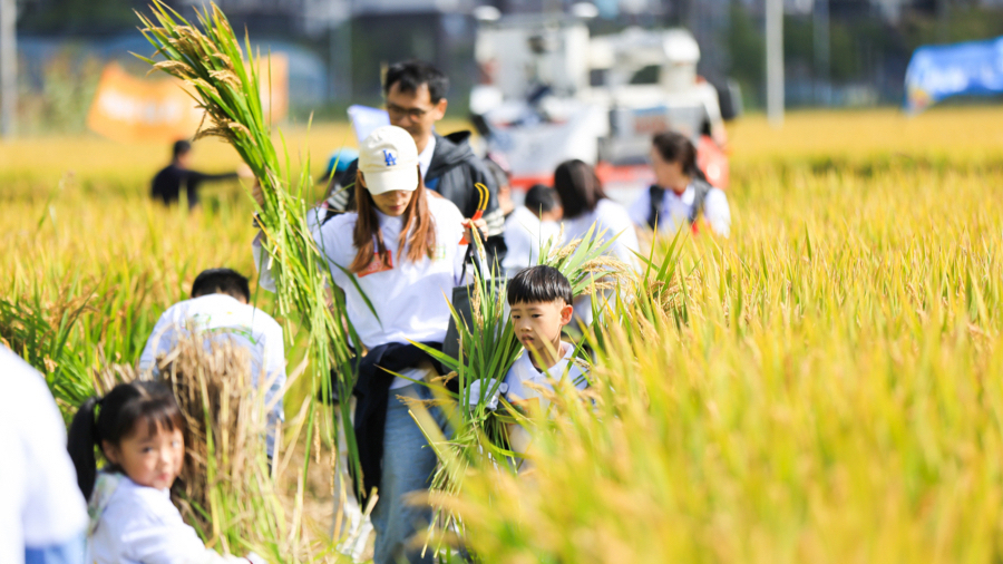 “弯下腰,俯下身,像这样用力一拉。”只听“咔嚓”一声,一束稻穗应声而落。8岁的李一言惊喜地跳起来:“割下来了!爸爸你闻,它好香啊!”他把稻穗凑近鼻尖,深深一嗅,脸上绽开灿烂的笑容。
